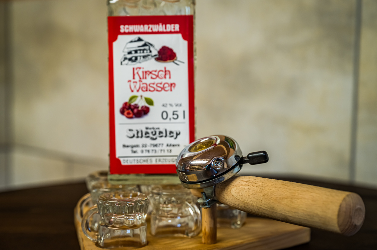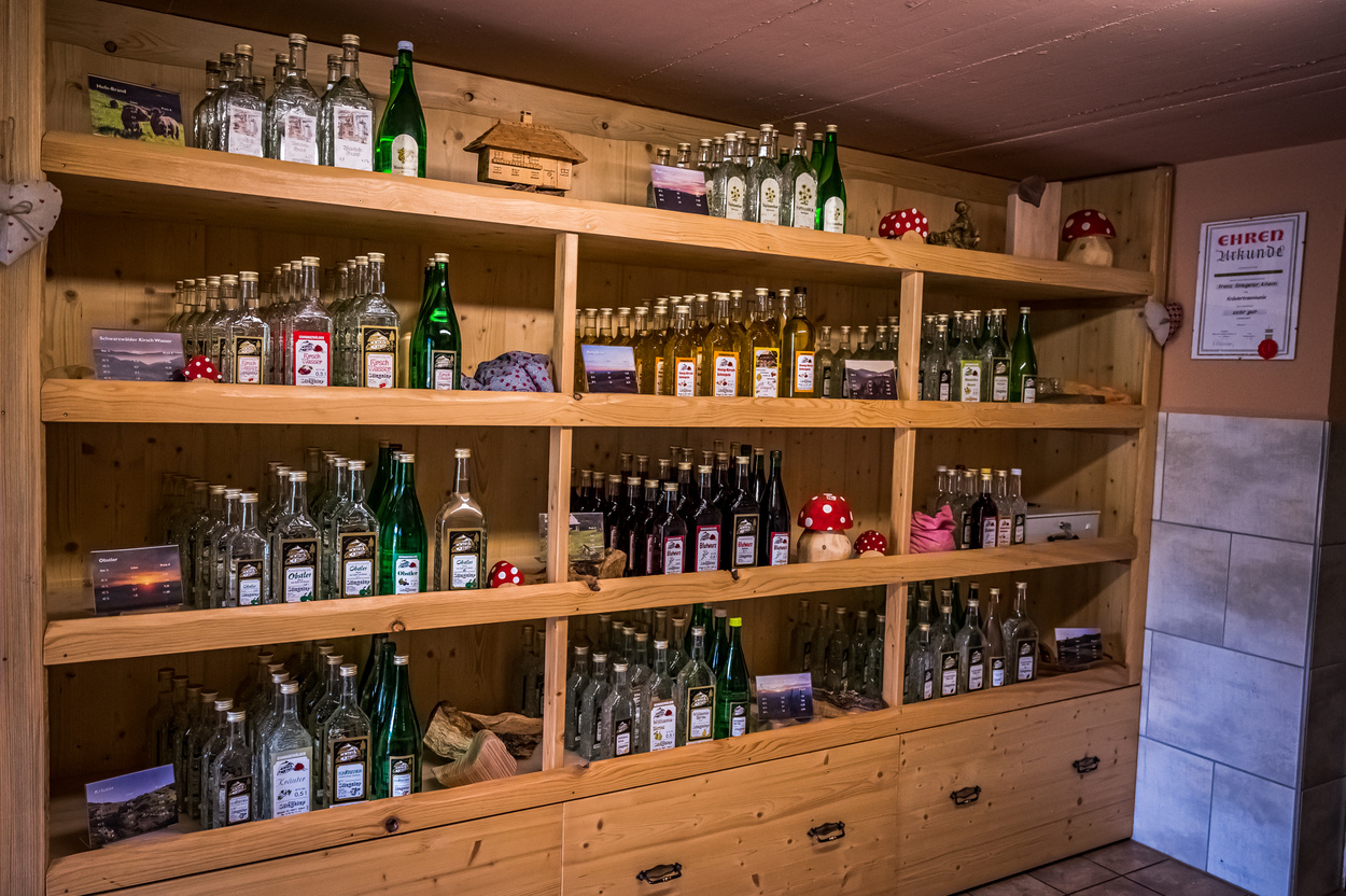 Blick auf das Haus Stiegeler  - Holzschilder an der Hausfassade mit der Beschriftung Haus Stiegeler, Schnapsbrennerei und Ferienwohnung, Gästezimmer  - Holzregal mit verschiedenen Schnapsflaschen  - Schnapsgläser auf einem Brett mit Radklingel im Hintergrund eine Flasche Kirschwasser  -