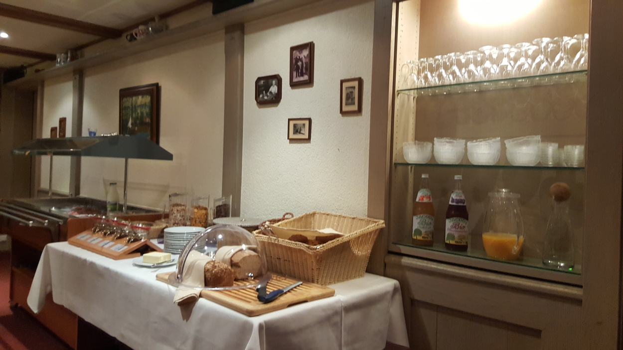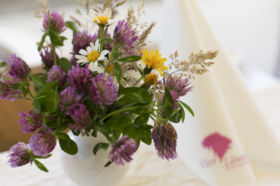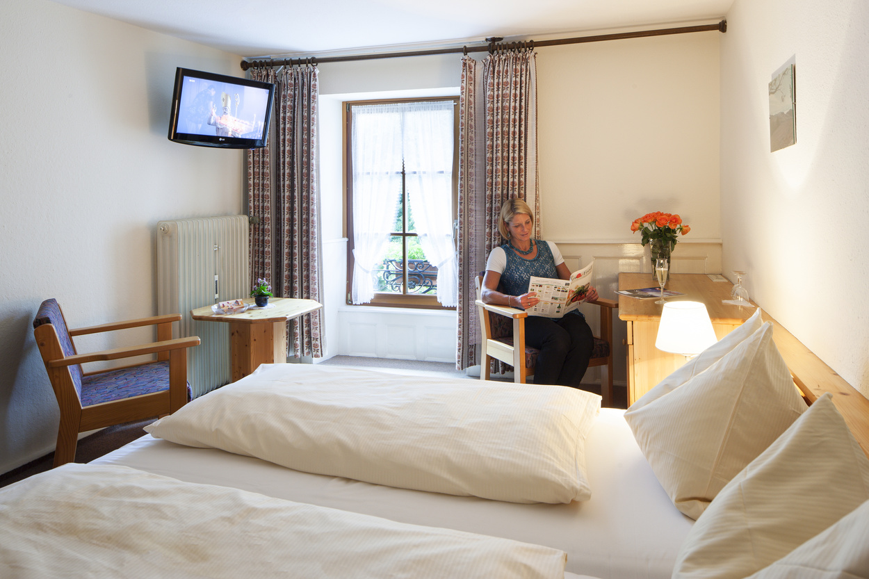 Doppelzimmer mit Balkon  - Beispiel eines Zimmers - Wiesenblumenstrauß - Frühstücksbuffet - Frühstückstisch  - Altes, traditionelles Wirtshausschild - Beispiel Doppelzimmer Belchen - Frau liest eine Zeitschrift im Doppelzimmer