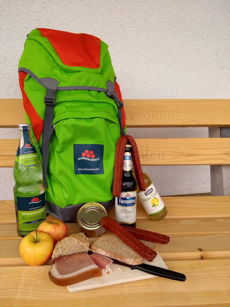 Auf Vorbestellung erhalten Sie bei uns ein Schwarzwälder Vesperrucksack. Teilen Sie uns einfach vor Ihrer Anreise mit, ob wir Ihnen ein Rucksack zum Preis von 15,00 €, für zwei Personen, bereit stellen sollen. Der Rucksack beinhaltet folgende Produkte: